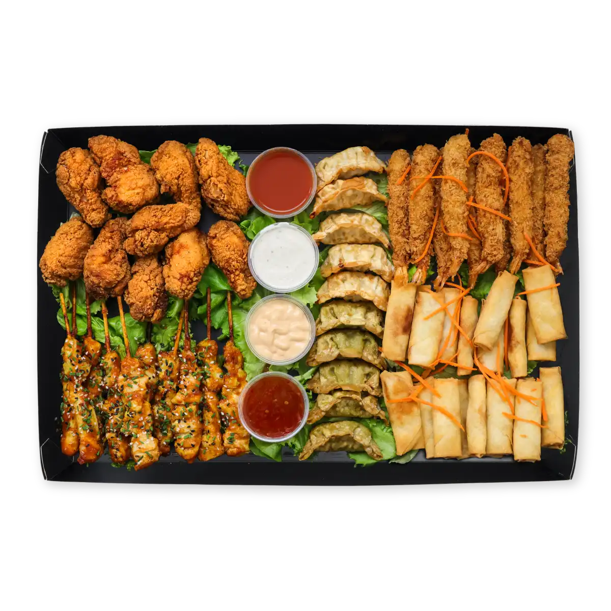 Fjölbreytt úrval af góðum bitum til að deila yfir spjalli. Inniheldur stökkar tempura rækjur, safarík satay kjúklingaspjót, klassíska kjúklingavængi, kjúklingadumplings og vegan grænmetisvorrúllur. Fjórar ljúffengar sósur fylgja með. Einfalt að taka lokið af og byrja að njóta.